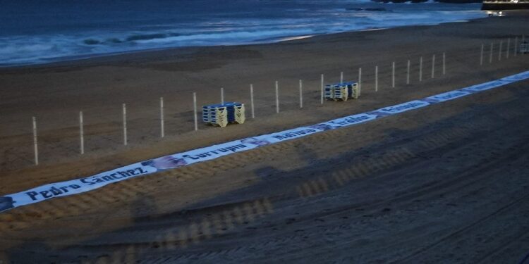 La playa de El Sardinero ha amanecido este viernes con una enorme pancarta extendida sobre la arena en la que se podían leer duras descalificaciones contra el presidente del Gobierno, Pedro Sánchez.
