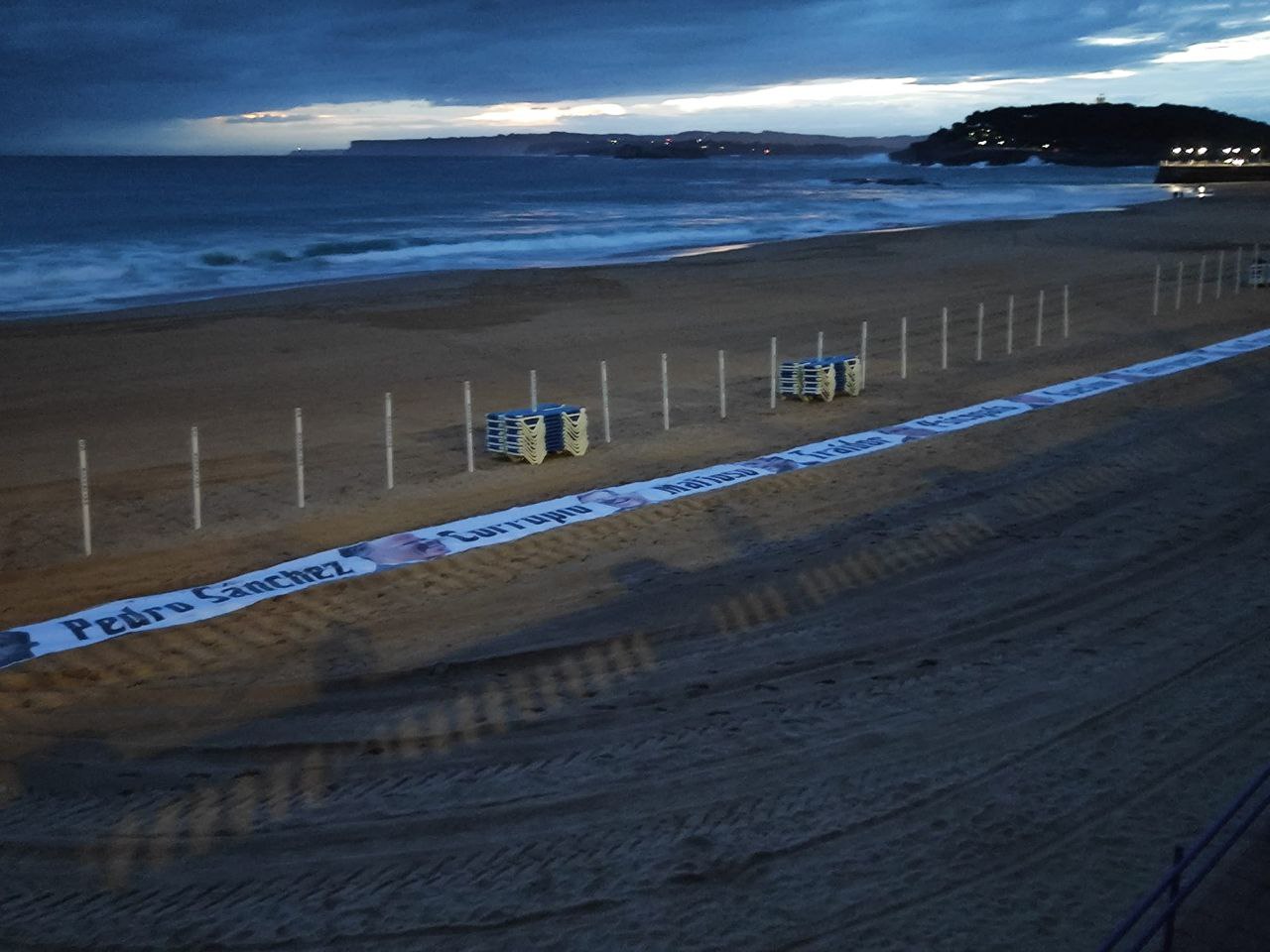 La playa de El Sardinero ha amanecido este viernes con una enorme pancarta extendida sobre la arena en la que se podían leer duras descalificaciones contra el presidente del Gobierno, Pedro Sánchez.