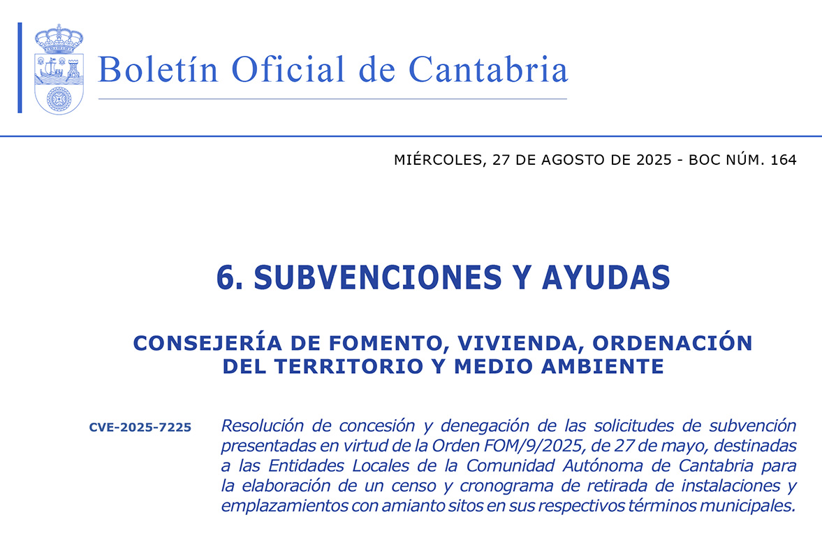 El Boletín Oficial de Cantabria (BOC) ha publicado hoy jueves, 27 de agosto, la resolución de la Consejería de Fomento, Vivienda, Ordenación del Territorio y Medio Ambiente relativo a la convocatoria de subvenciones destinadas a las entidades locales de Cantabria para la elaboración de un censo y cronograma de retirada de instalaciones y emplazamientos con amianto situados en sus respectivos términos municipales.