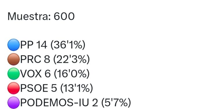 En relación con los últimos resultados autonómicos, el PP perdería un escaño (de 15 a 14), el PRC se mantendría en 8, VOX subiría de 4 a 6 y el PSOE experimentaría el retroceso más acusado, pasando de 8 a 5 diputados.