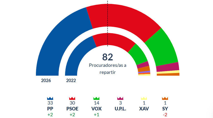 El PSOE también experimenta una mejora en su representación parlamentaria. Con dos procuradores más que en la anterior legislatura, los socialistas recuperan parte del apoyo electoral perdido en anteriores procesos y refuerzan su presencia en el parlamento autonómico.